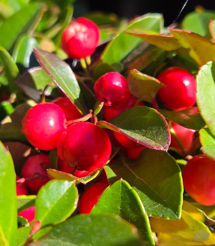 An attractive, evergreen groundcover that saves its best show for fall and winter with red-tinged, dark green foliage and an outstanding display of large red berries that are both persistent and edible. Dense, compact and hardy.
